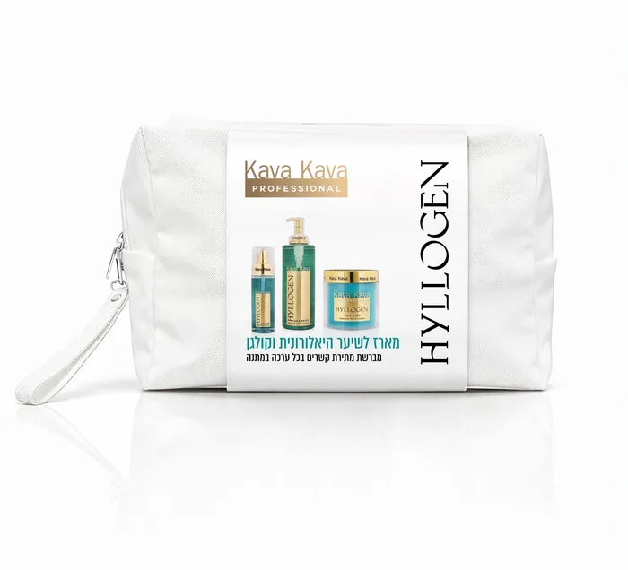 התיק מכיל מסכה היילוגן 500 מ"ל, שמפו היילוגן ללא מלחים 500 מ"ל, סרום היילוגן 100 מ"ל ומברשת מתירה קשרים
